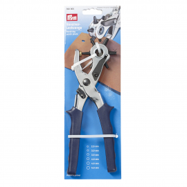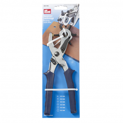 The sturdy Prym revolving punch pliers are an absolute all-roander. They are not only suitable for punching holes in textiles or leather - they are also perfect for craft materials such as cardboard and much more. The revolving punch pliers punch 6 different hole sizes from 2.5 mm to 5 mm. The handles of the revolving punch pliers are plum blue and, because of the external grooves, each finger has a good grip. A locking latch keeps the revolving punch pliers together when not in use - this makes room for the sewing and craft tools.