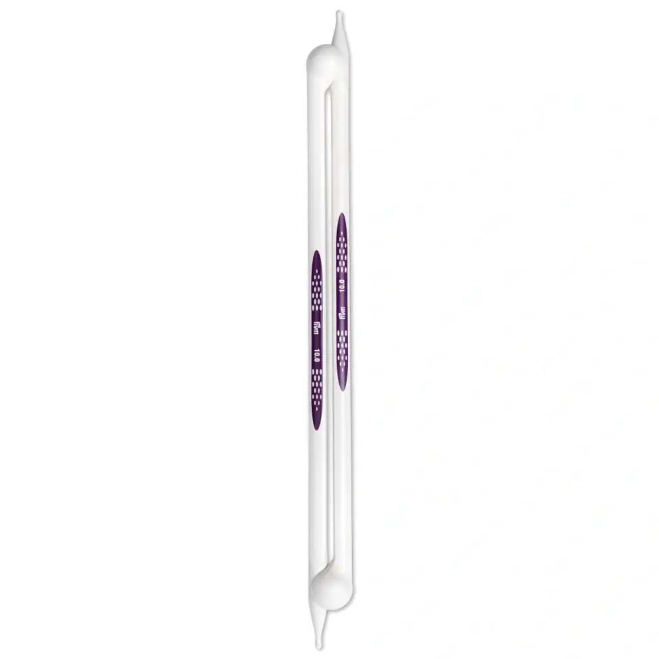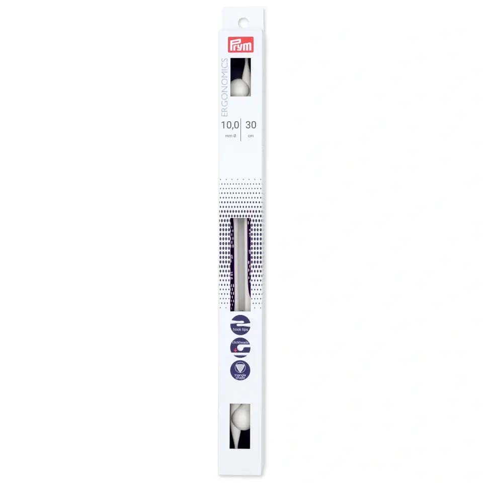 The innovative prym.ergonomics single-pointed knitted needles are a synonym for ease of knitting. The alabaster white knitting needles are made from high-performance synthetic material and are light and flexible and sit comfortably in the hand. The drop-shaped points make the single-pointed knitted needles ideal for beginners, since the yarn slides so easily over the points, and picking up the yarn becomes extremely easy. The shaft of the needle is rounded at the front and changes to a triangular cross-section - this allows the stitches to glide freely and easily. The click heads are brilliantly designed to keep two needles together as a pair on one hand and on the other they serve as stitch stoppers. The needle gauges are printed centrally on the needles. All in all: The prym.ergonomics single-pointed knitted needles offer pure knitting joy, even when used over long periods.