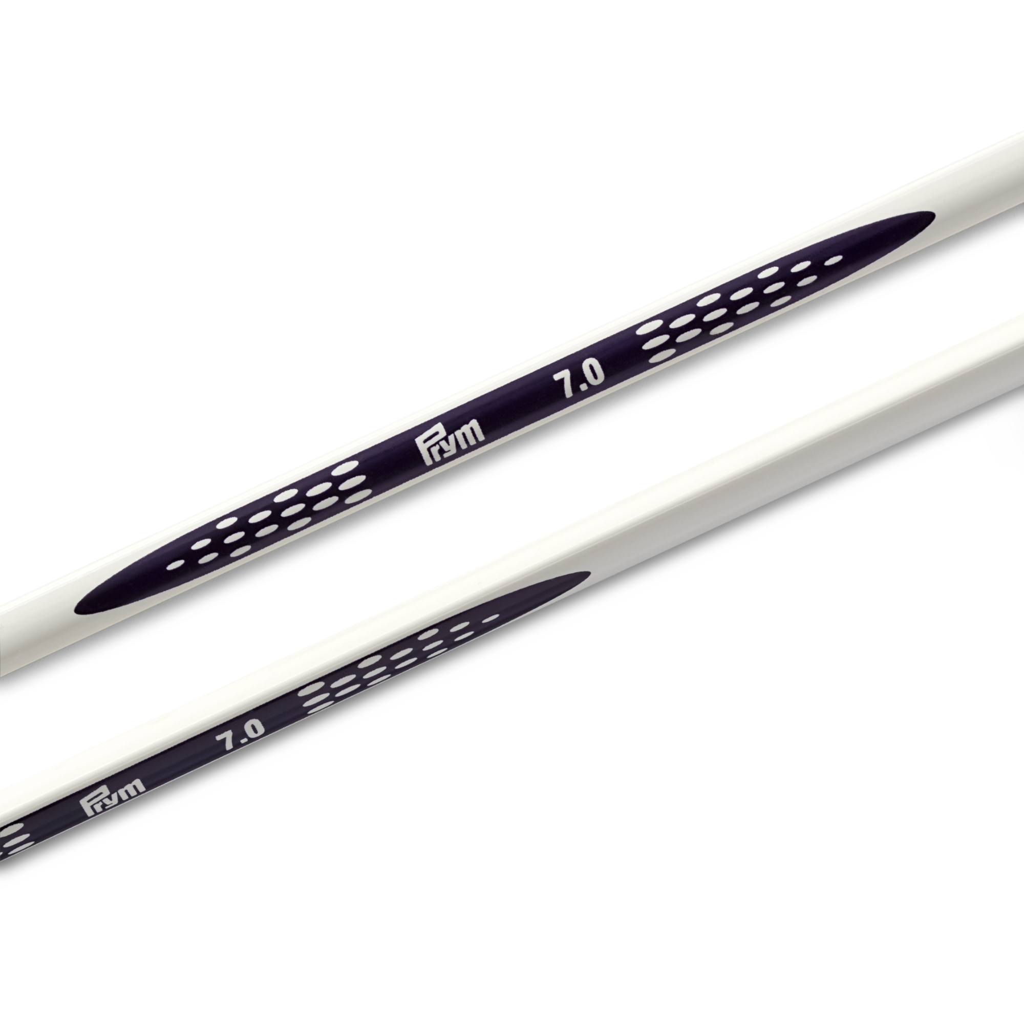 The innovative prym.ergonomics single-pointed knitted needles are a synonym for ease of knitting. The alabaster white knitting needles are made from high-performance synthetic material and are light and flexible and sit comfortably in the hand. The drop-shaped points make the single-pointed knitted needles ideal for beginners, since the yarn slides so easily over the points and picking up the yarn becomes extremely easy. The shaft of the needle is rounded at the front and changes to a triangular cross-section - this allows the stitches to glide freely and easily. The click heads are brilliantly designed to keep two needles together as a pair on one hand and on the other they serve as stitch stoppers. The needle gauges are printed centrally on the needles. All in all: The prym.ergonomics single-pointed knitted needles offer pure knitting joy, even when used over long periods.
