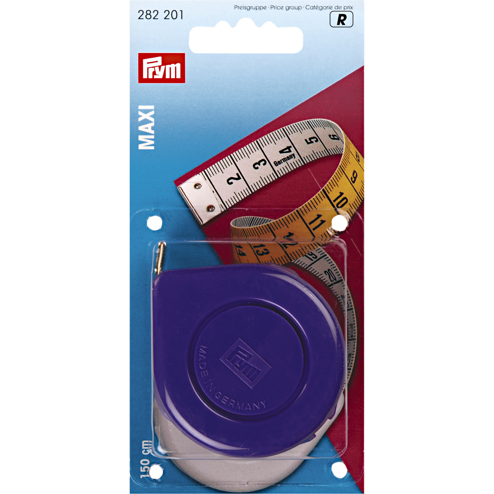 The Prym MINI and MAXI spring tape measures with a running length of 150 cm / 60 inches and the Jumbo with 300 cm/120 inches are both functional and handy. The tape measure is optionally metric scaled on both sides or on the front side in centimetres and on the back in inches. A retention mechanism holds the tape measure while working in the desired position. By pressing a button, a spring mechanism reels in the tape after measuring and brings it back neatly into the housing. The simple and practical handling makes this spring tape measure into a useful tool for sewing, tailoring and handicrafts.