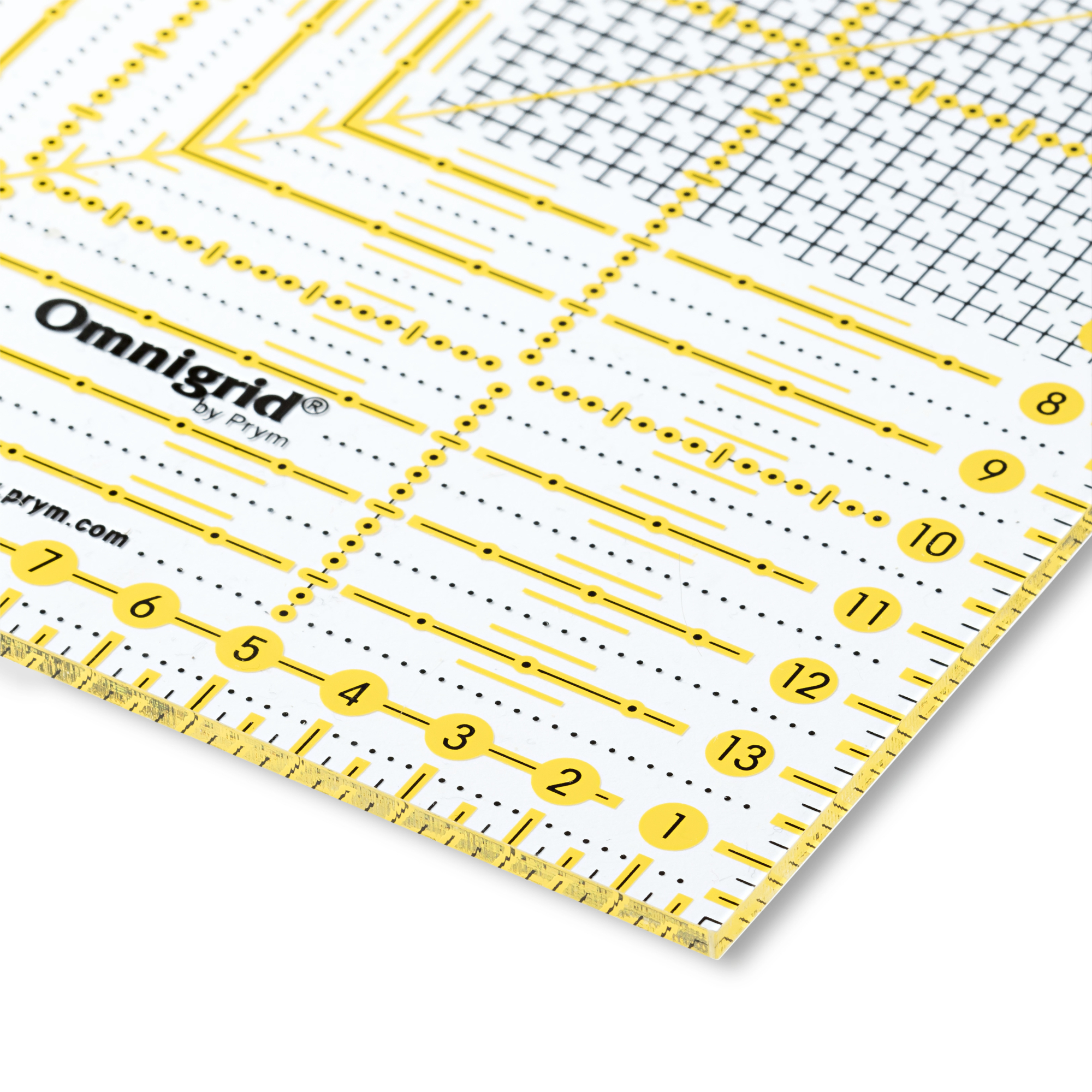 Whether on the cutting table or the sewing machine: the Omnigrid universal rulers from Prym are indispensable companions for patchwork, dressmaking and tailoring or for graphic work. The yellow and black grid markings in a metric or inch scale make it possible to mark accurately on both dark and light fabrics. The scratch-resistant laser print on the underside of the ruler prevents visual distortion. Thick, resistant, durable material guarantees safe guiding of rotary cutters and art knives on the cutting mat. Some versions of the Omnigrid rulers also have 30, 45 and 60 degree angle markings for cutting out triangles, diamonds and strips on the bias. To keep things tidy, it can be hung up by its eyelet.