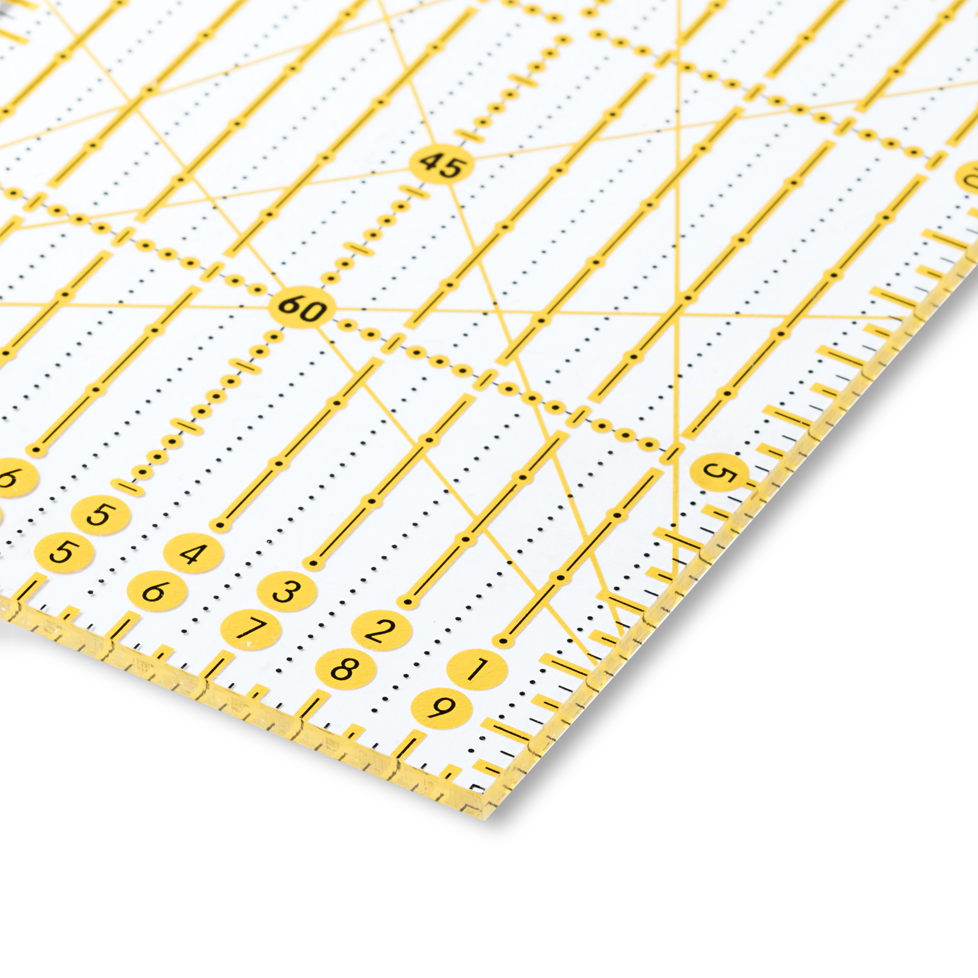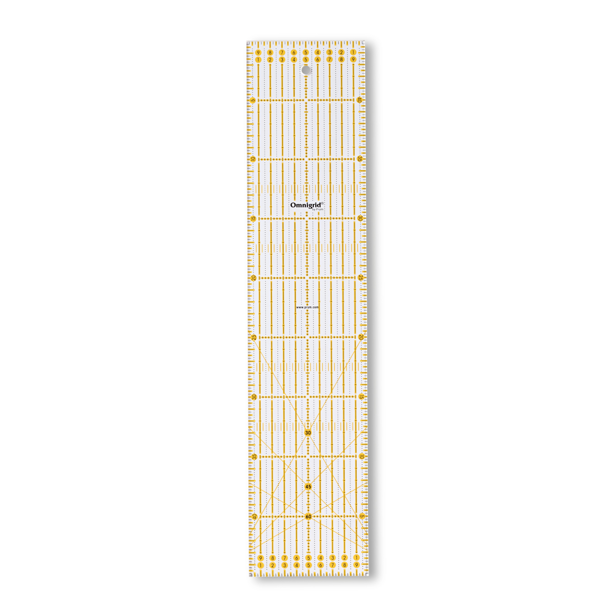 Whether on the cutting table or the sewing machine: the Omnigrid universal rulers from Prym are indispensable companions for patchwork, dressmaking and tailoring or for graphic work. The yellow and black grid markings in a metric or inch scale make it possible to mark accurately on both dark and light fabrics. The scratch-resistant laser print on the underside of the ruler prevents visual distortion. Thick, resistant, durable material guarantees safe guiding of rotary cutters and art knives on the cutting mat. Some versions of the Omnigrid rulers also have 30, 45 and 60 degree angle markings for cutting out triangles, diamonds and strips on the bias. To keep things tidy, it can be hung up by its eyelet.