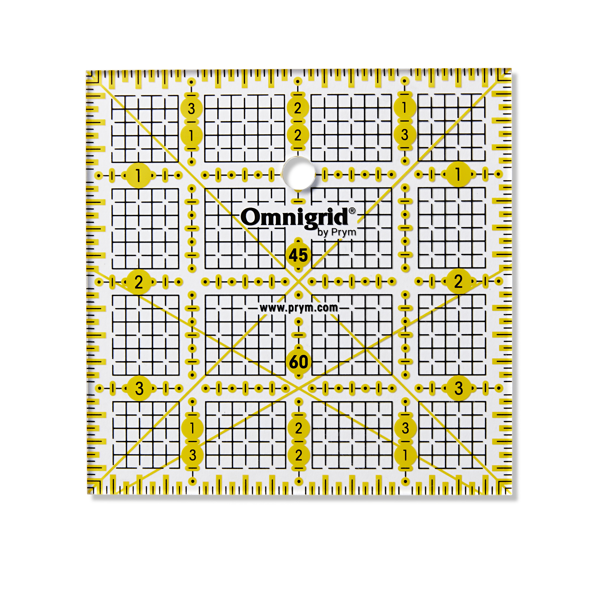 Whether on the cutting table or the sewing machine: the Omnigrid universal rulers from Prym are indispensable companions for patchwork, dressmaking and tailoring or for graphic work. The yellow and black grid markings in a metric or inch scale make it possible to mark accurately on both dark and light fabrics. The scratch-resistant laser print on the underside of the ruler prevents visual distortion. Thick, resistant, durable material guarantees safe guiding of rotary cutters and art knives on the cutting mat. Some versions of the Omnigrid rulers also have 30, 45 and 60 degree angle markings for cutting out triangles, diamonds and strips on the bias. To keep things tidy, it can be hung up by its eyelet.