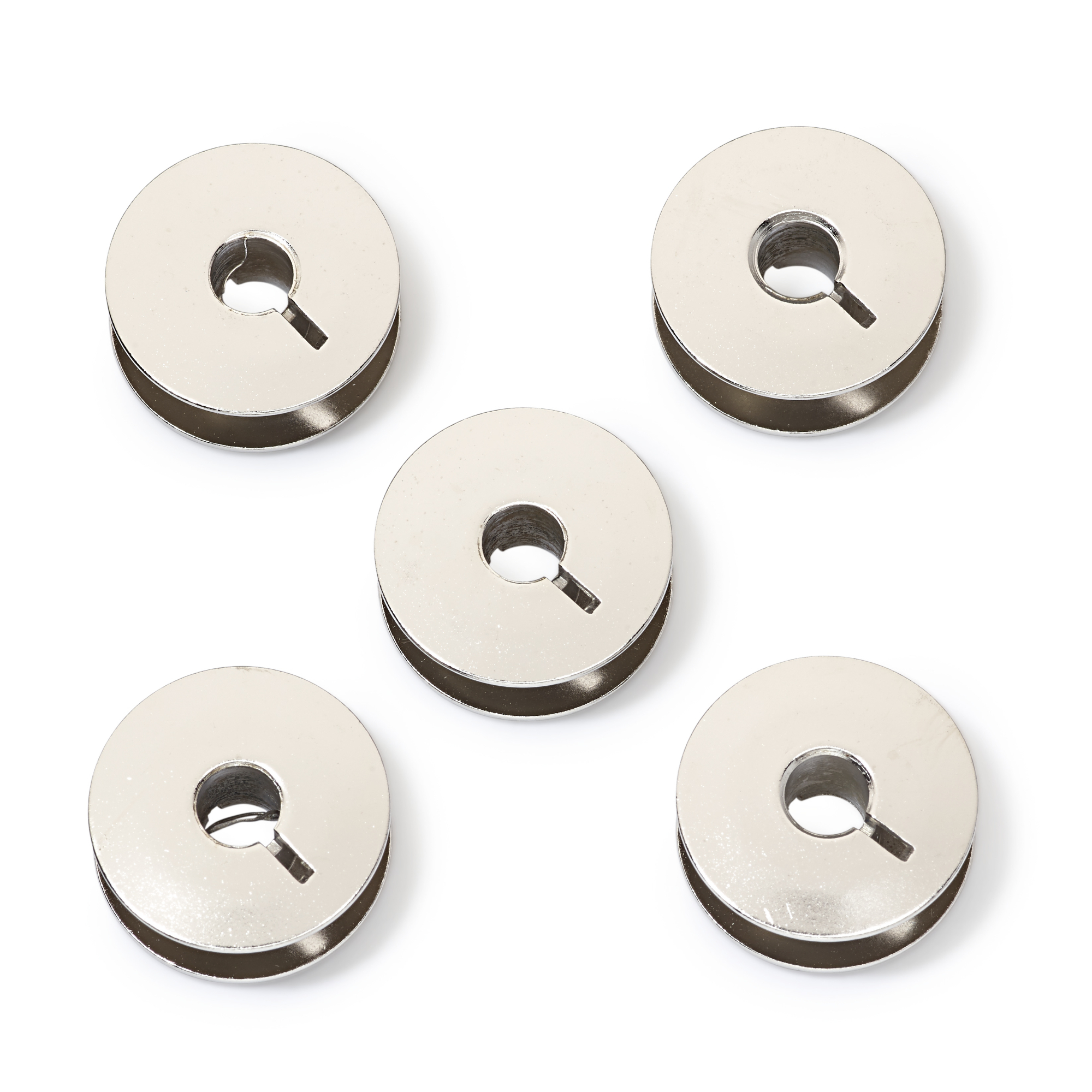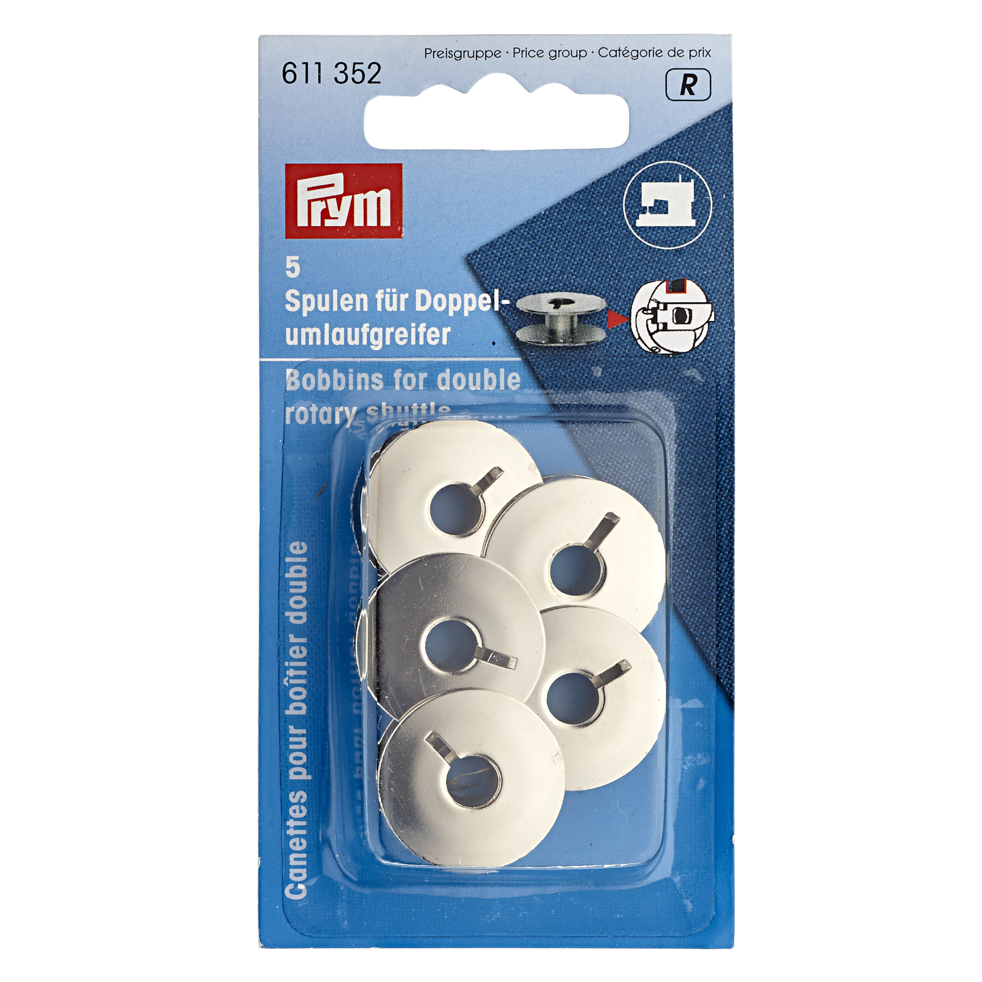 The rotary bobbin hook and the double-rotary bobbin hook are the most robust and easy-care for the majority of systems that are mainly installed in high-priced and industrial sewing machines. Prym offers the corresponding bobbins for small rotary bobbin hooks and the double-rotary bobbin hook made of metal of five units or transparent plastic of four units. The bobbins made of transparent plastic help to keep an overview of thread colours and quantity remaining, while the metal bobbins have a significantly longer service life due to the additional robustness of their material. Manufacturers of sewing machines that use this system are, among others SINGER, DÜRR KOPP, PFAFF and CHAMPION.