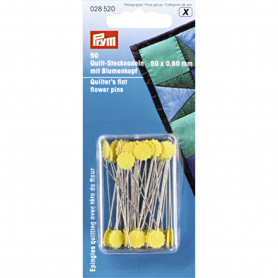 These long pins are equipped with a flat, flower-shaped head made of heat-resistant, yellow plastic and are specially tailored to the needs of patchwork and quilt work. This highly-stable connection between the stem and head for high stress and even, pore-free surface coating round off the requirements profile. Its fine tip easily penetrates several layers of fabric without damaging the fibres. The pins’ flat heads even let you easily iron over them. Prym sells the quilt pins in a transparent canister of 50 units each.