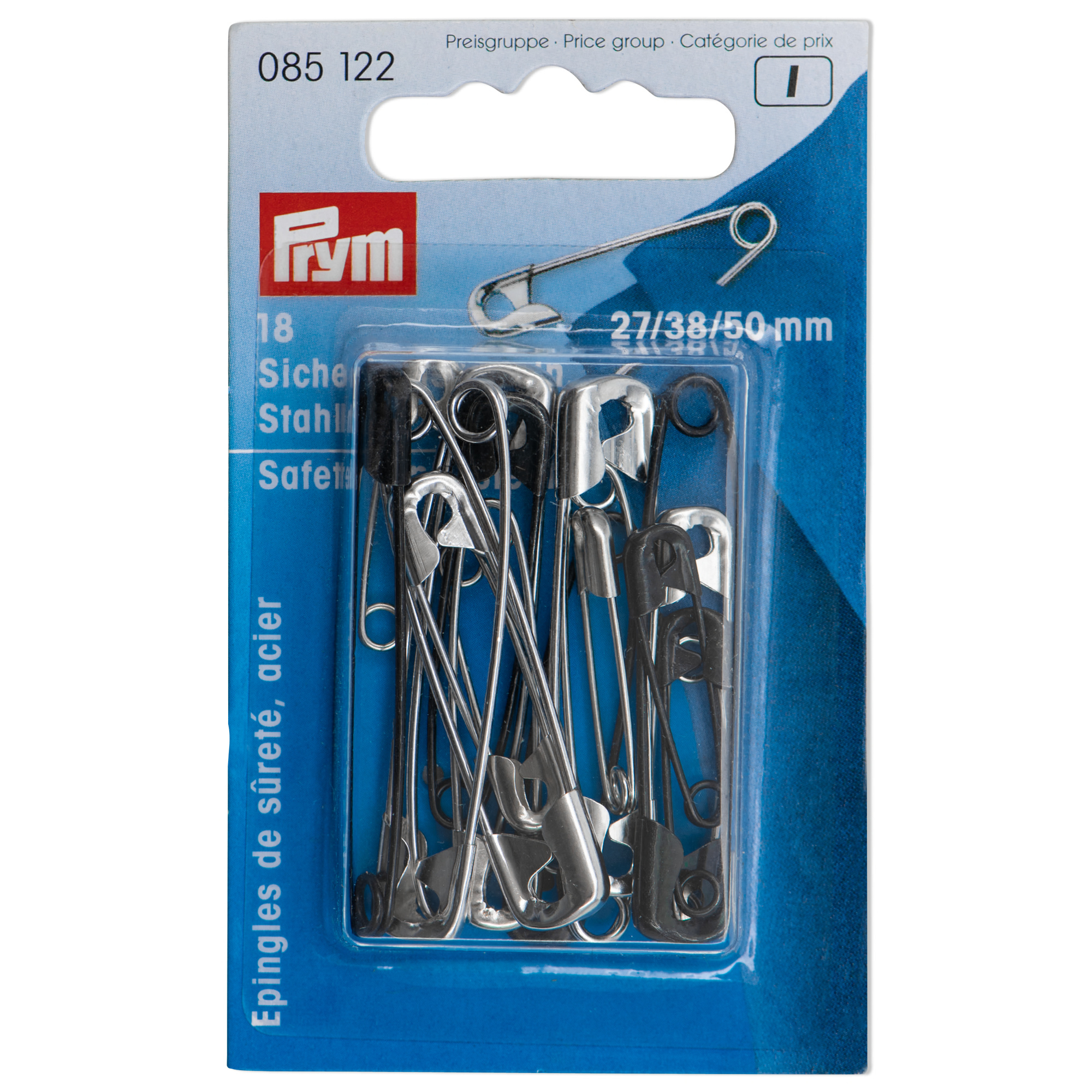 Steel safety pins are the most utilised securing aids when sewing, quilting and doing patchwork and are also universally used in many day-to-day situations. They are coated with rust protection, and the sleek tips make them easy to insert, even in thick and firm material, and are gentle on the fabric. The pins also have a high level of fastening force when opened and closed frequently, since the steel used has balanced spring force. Prym provides the silver or black-coated pins sorted according to size, from 19 mm to 57 mm and in various mixed assortments.
