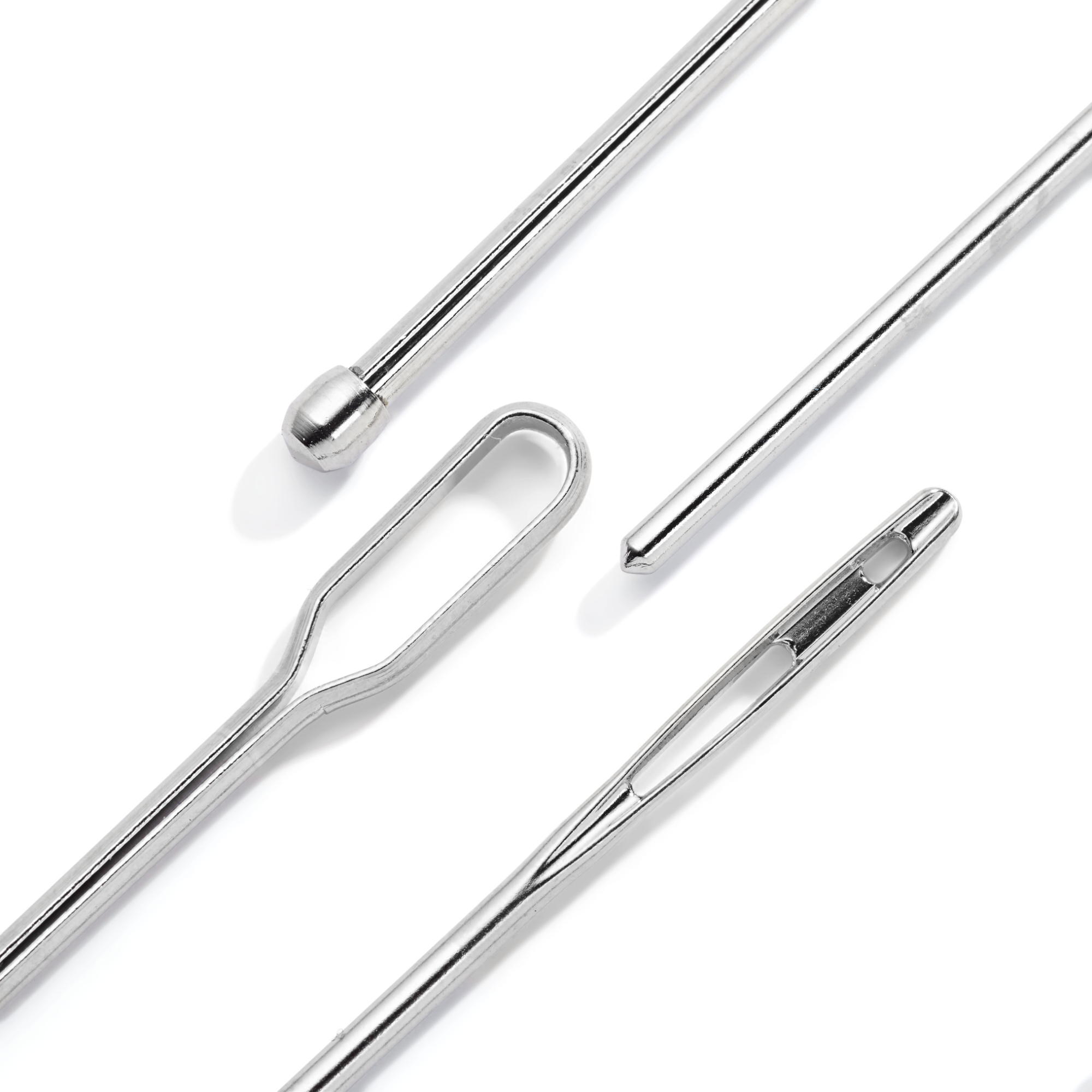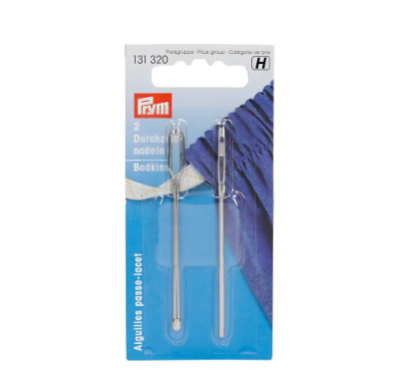 These bodkins, made of hardened steel and refined brass, are suitable for inserting elastic tapes and cords through a waistband, hood tunnelling, etc. The brass version is a needle that is divided at the shank and open towards the eye, which gives the tip of the needle a spherical shape. If a tape is threaded through this eye and then inserted down the needle shaft halves, it gets caught and can then be pulled through the tunnel while it is securely anchored. The other bodkin, made of stainless steel, is also a blunt needle. However, it has a wide, flattened, and thus, thinner needle shaft with a long and round eye. The long eye is designed to take up tapes and thick yarns, the round one is suitable for finer yarns and o-rings. The needles’ burr-free, rounded tips cannot pierce through the material and therefore slide easily through any fabric loop or tube. The balanced spring stiffness and smooth surface make these needles professional tools.