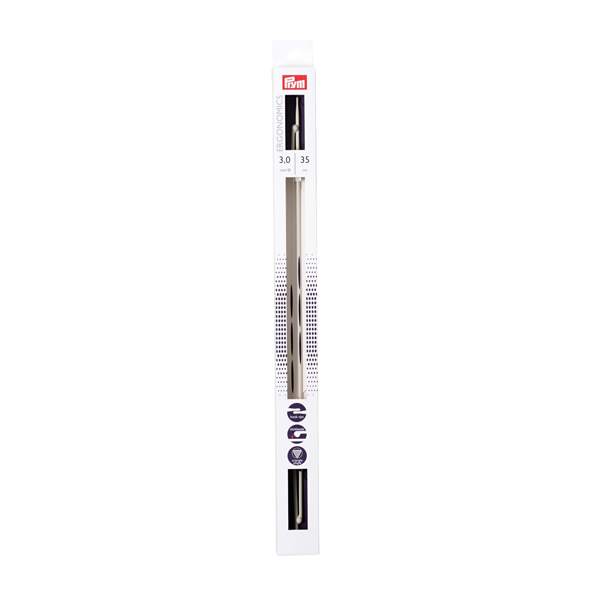 The innovative prym.ergonomics single-pointed knitted needles are a synonym for ease of knitting. The alabaster white knitting needles are made from high-performance synthetic material and are light and flexible and sit comfortably in the hand. The drop-shaped points make the single-pointed knitted needles ideal for beginners, since the yarn slides so easily over the points and picking up the yarn becomes extremely easy. The shaft of the needle is rounded at the front and changes to a triangular cross-section - this allows the stitches to glide freely and easily. The click heads are brilliantly designed to keep two needles together as a pair on one hand and on the other they serve as stitch stoppers. The needle gauges are printed centrally on the needles. All in all: The prym.ergonomics single-pointed knitted needles offer pure knitting joy, even when used over long periods.