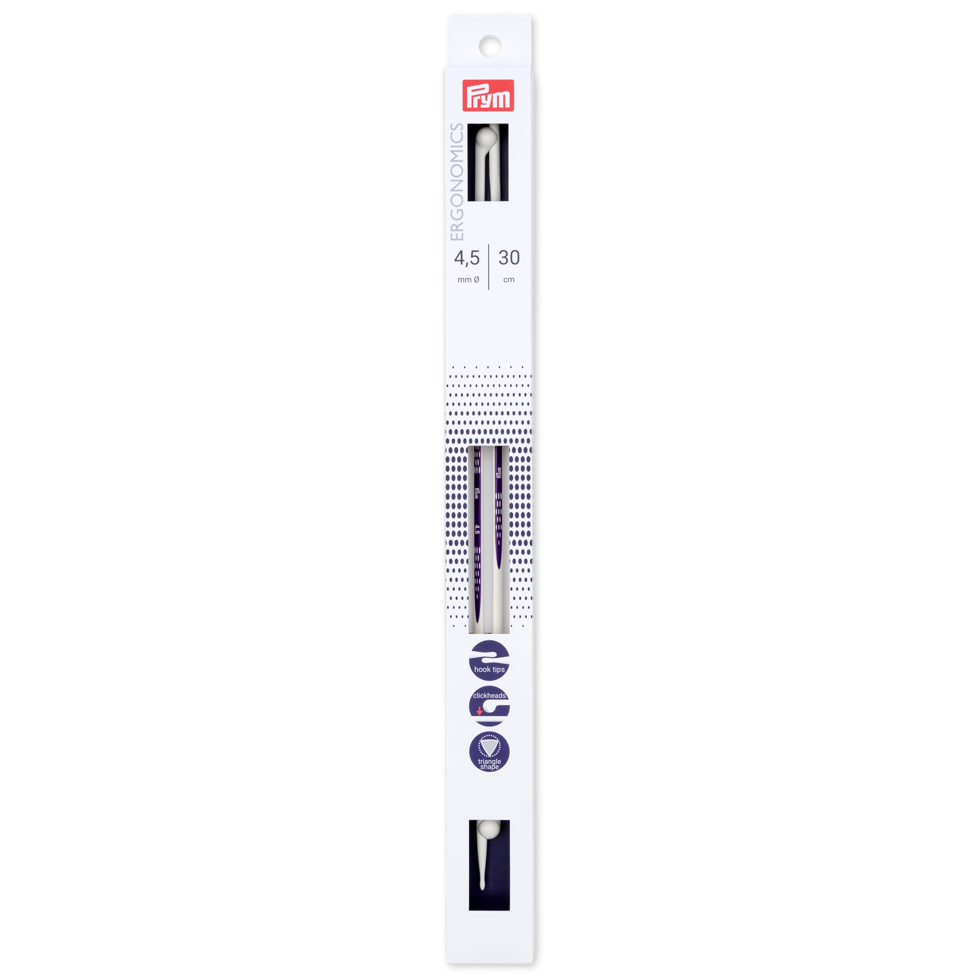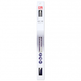 The innovative prym.ergonomics single-pointed knitted needles are a synonym for ease of knitting. The alabaster white knitting needles are made from high-performance synthetic material and are light and flexible and sit comfortably in the hand. The drop-shaped points make the single-pointed knitted needles ideal for beginners, since the yarn slides so easily over the points and picking up the yarn becomes extremely easy. The shaft of the needle is rounded at the front and changes to a triangular cross-section - this allows the stitches to glide freely and easily. The click heads are brilliantly designed to keep two needles together as a pair on one hand and on the other they serve as stitch stoppers. The needle gauges are printed centrally on the needles. All in all: The prym.ergonomics single-pointed knitted needles offer pure knitting joy, even when used over long periods.