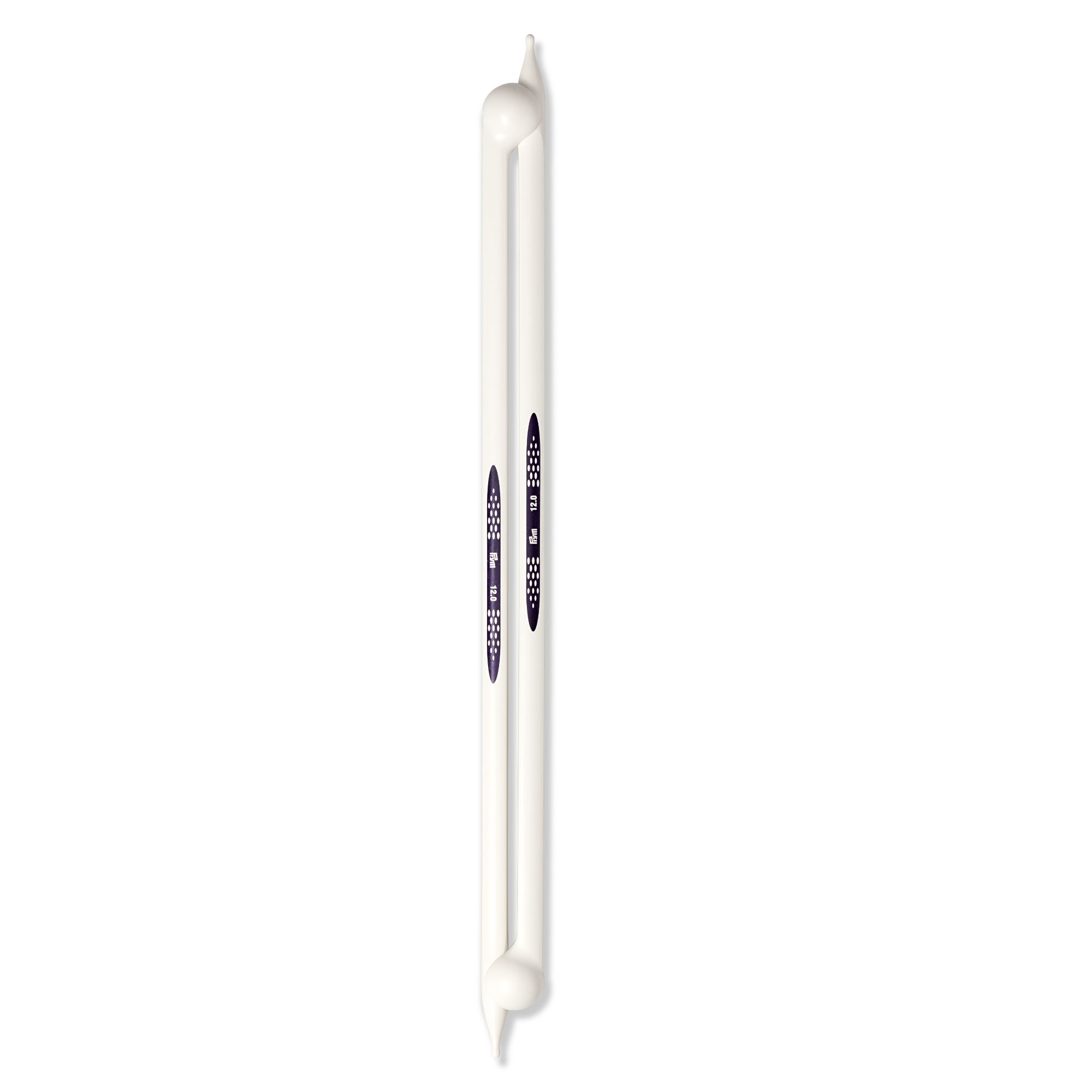 The innovative prym.ergonomics single-pointed knitted needles are a synonym for ease of knitting. The alabaster white knitting needles are made from high-performance synthetic material and are light and flexible and sit comfortably in the hand. The drop-shaped points make the single-pointed knitted needles ideal for beginners, since the yarn slides so easily over the points and picking up the yarn becomes extremely easy. The shaft of the needle is rounded at the front and changes to a triangular cross-section - this allows the stitches to glide freely and easily. The click heads are brilliantly designed to keep two needles together as a pair on one hand and on the other they serve as stitch stoppers. The needle gauges are printed centrally on the needles. All in all: The prym.ergonomics single-pointed knitted needles offer pure knitting joy, even when used over long periods.