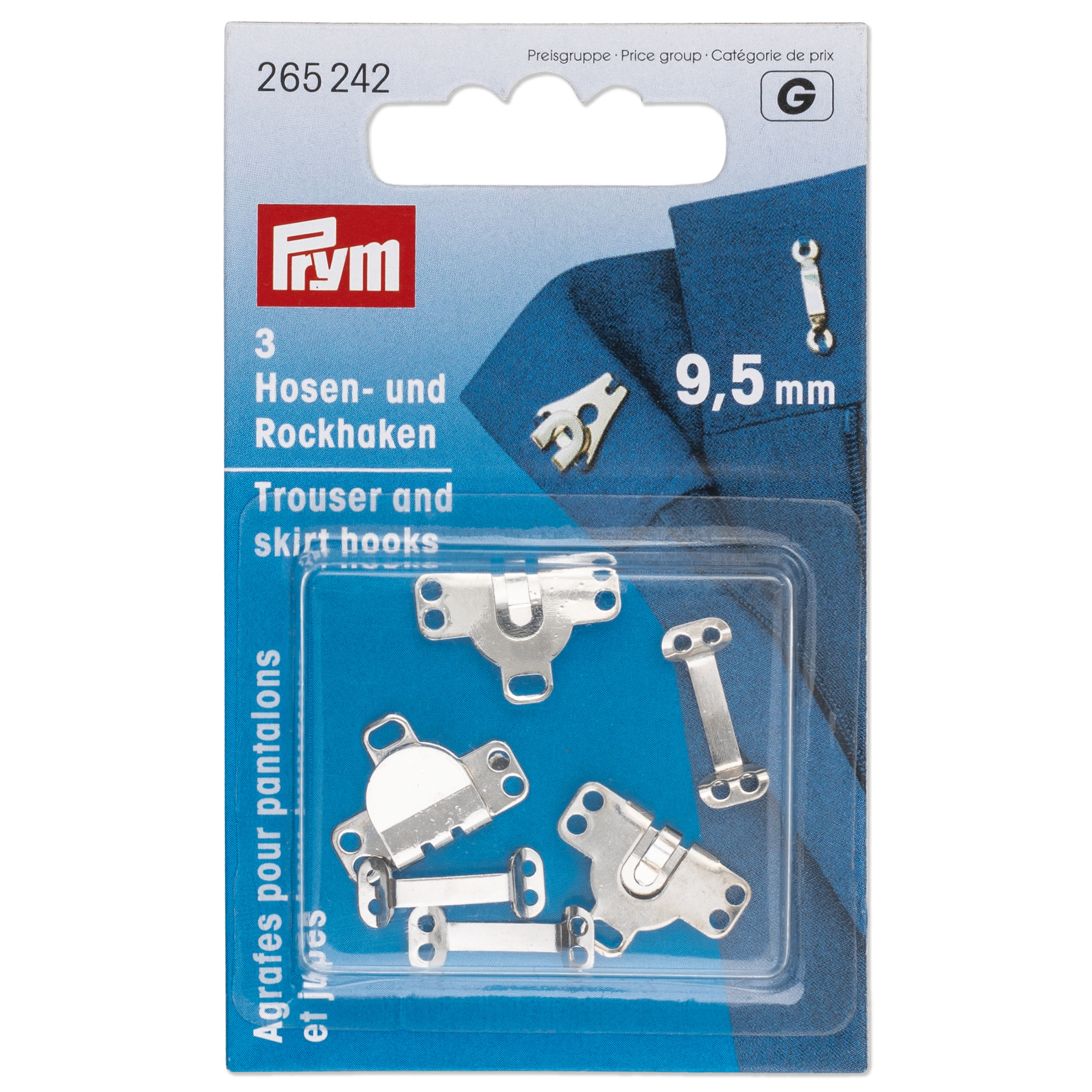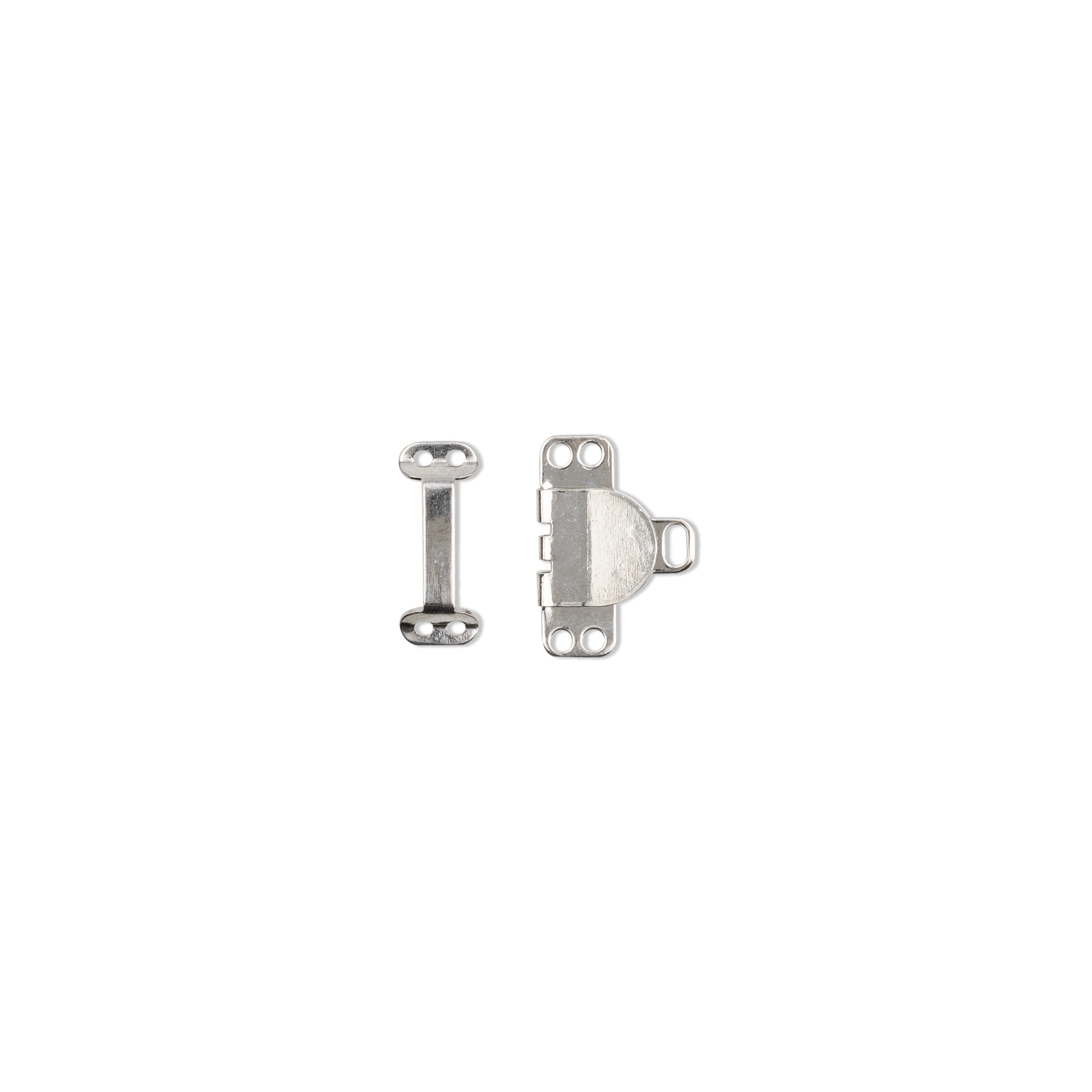 A real classic! The trouser and skirt hook is the best solution for fastening trousers and skirts quickly, easily and almost invisibly. Its flat finish events it being bulky. Unobtrusive in appearance and manufactured in rust-protected metal, the trouser and skirt hook scores principally because of its smooth surface and rounded edges, which make it pleasant to the touch when fastening or unfastening it. It has been designed to be easy to sew on; the trouser hook has three holes for sewing it on and the bar has two holes. The trouser or skirt hook is available in silver and black and a variety of widths. Each packet contains two hooks and bars.