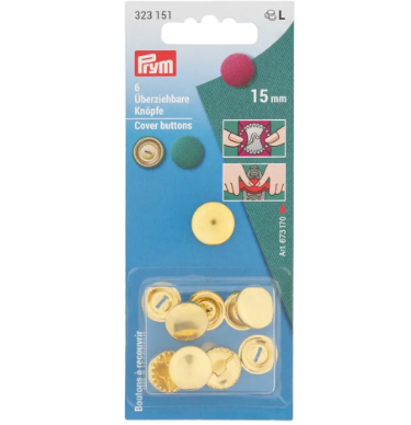 These Prym button blanks made of stainless metal and a stable wire eyelet are available in many sizes between 11 mm and 38 mm. Therefore, you can create the right button for any of your own creations, giving you limitless possibilities for your own creativity. A gearwheel on the inside helps the fabric stretch evenly. The back of the packaging has illustrated instructions in three steps on how it works. A cutting template is also illustrated for cutting a circle in the fabric. Depending on the textile used, the finished buttons can be washed at up to 60 degrees. They are also available in bulk packaging with 100 units for professional needs.