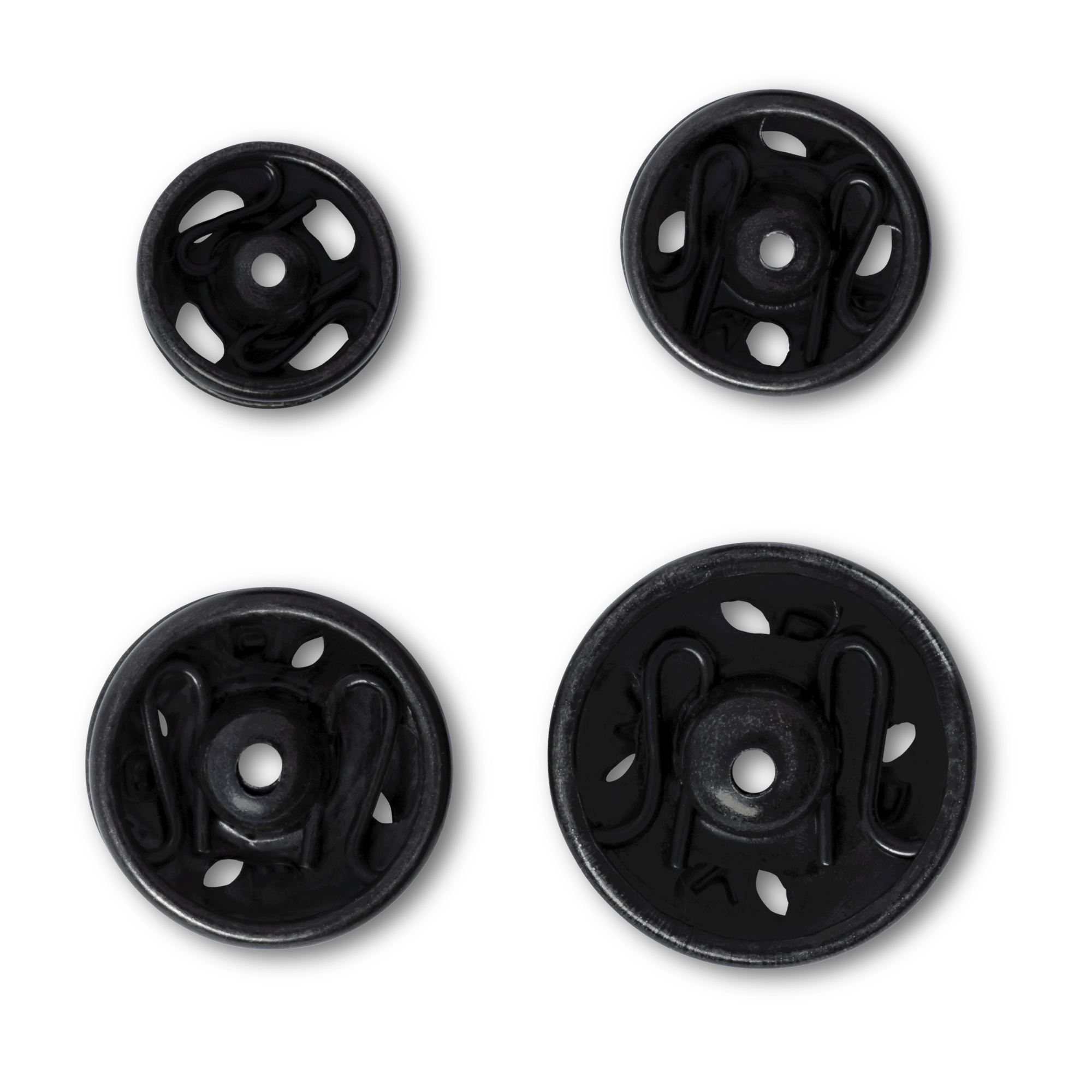 These round sew-on snap fasteners made from rust-proof brass are real all-rounders, because they are versatile decorations for everyday clothing or for accessories. The sew-on snap fasteners consist of a spring section and a stud. The lower section (stud) is folded back - this protects the fabric from being damaged by sharp edges. The closure is easy to manipulate and just as easy to sew on; the four slots guarantee that the snap fasteners can be sewed on evenly. The sew-on snap fasteners are available in silver, black and gold.
