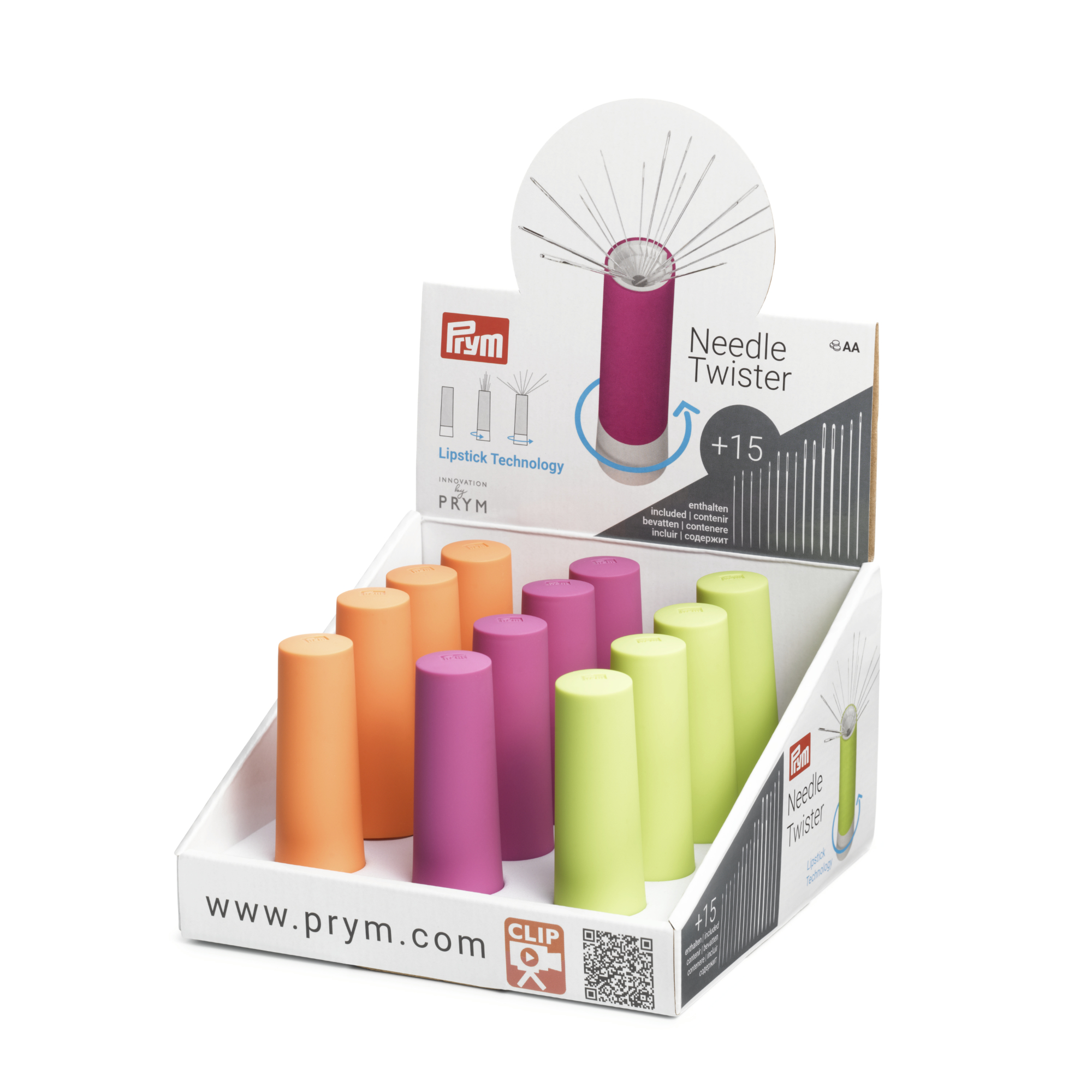 Perfect for beginners or as practical basic equipment. With the contents of this needle twister you have a wide range of different needles immediately to hand and when not in use they can be safely stored. The twist mechanism is easy to use and when unscrewed the needles fan out.. A reliable magnet in the interior holds the needles in position – if needles are lying loose on the table, they can be quickly and safely gathered up by the magnet. The needle twister is available in fresh pink, orange and light green and contains 15 sewing, embroidery and darning needles.