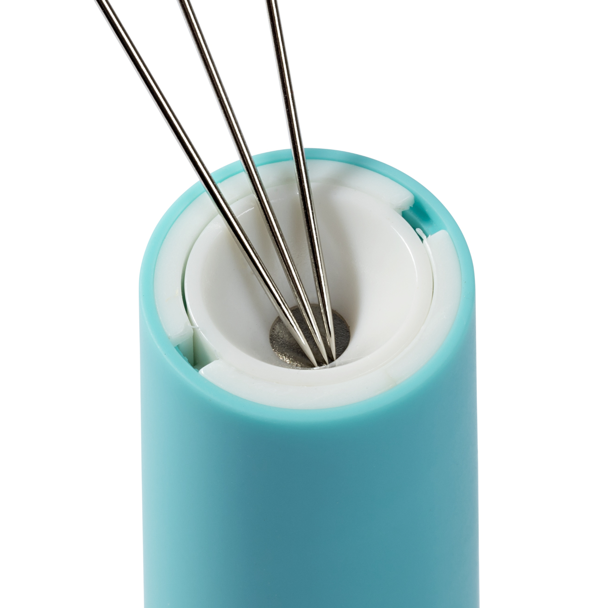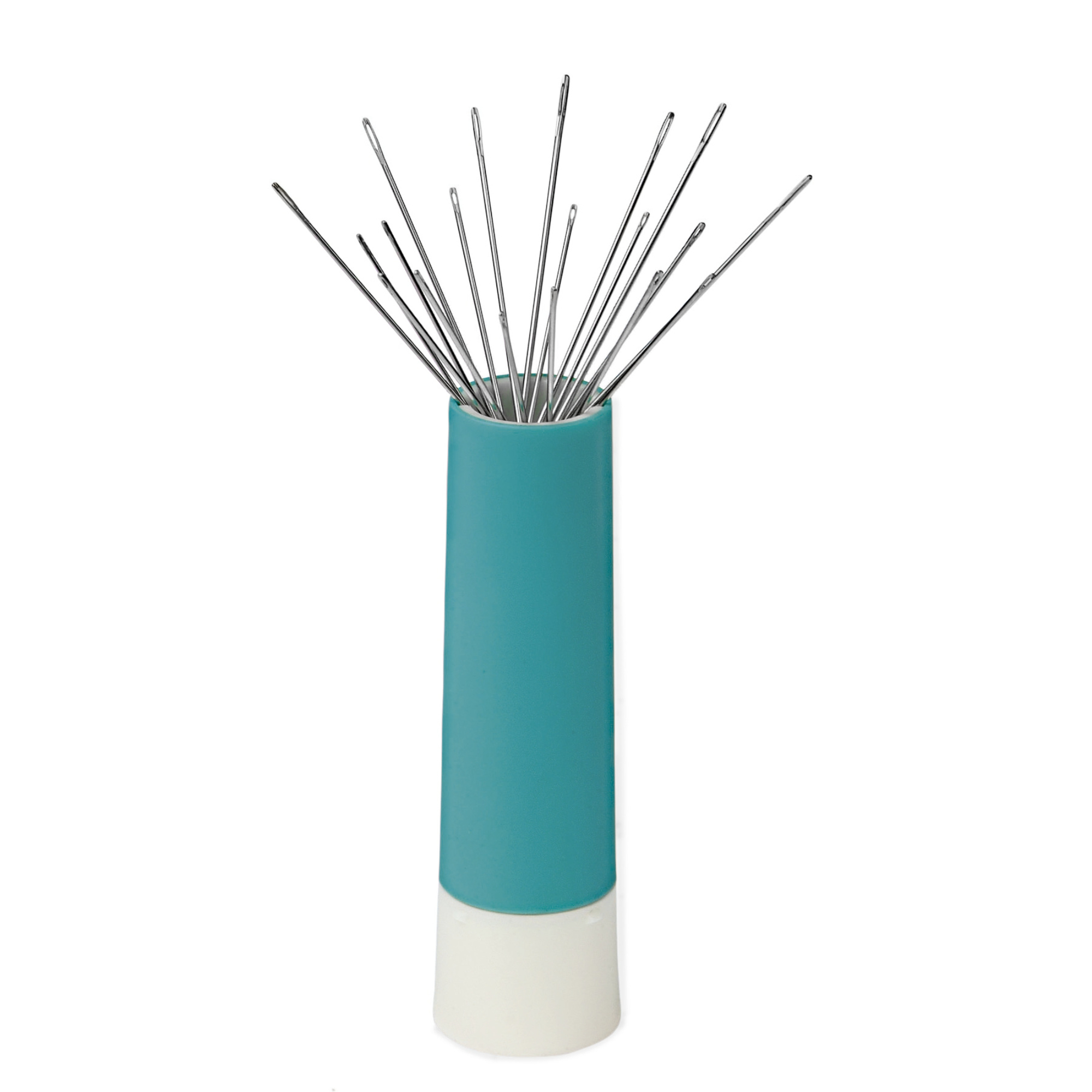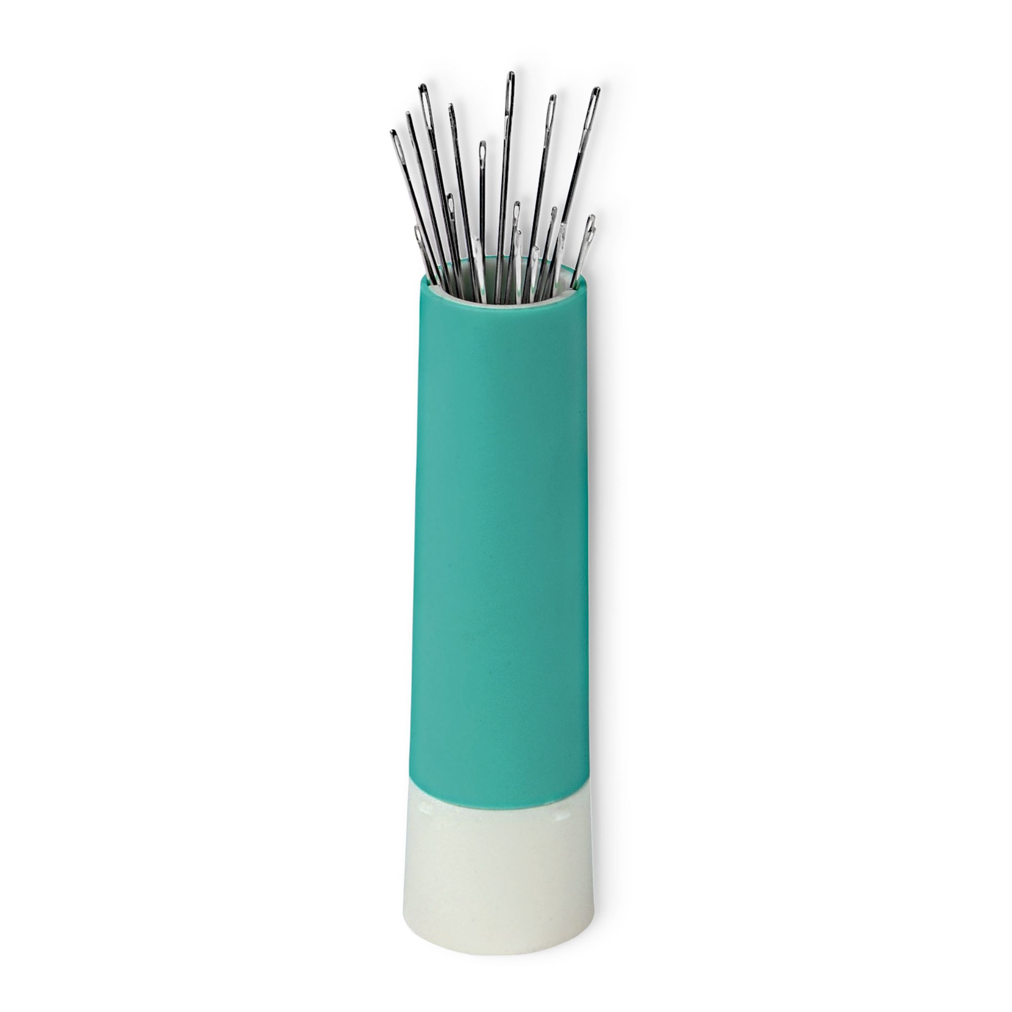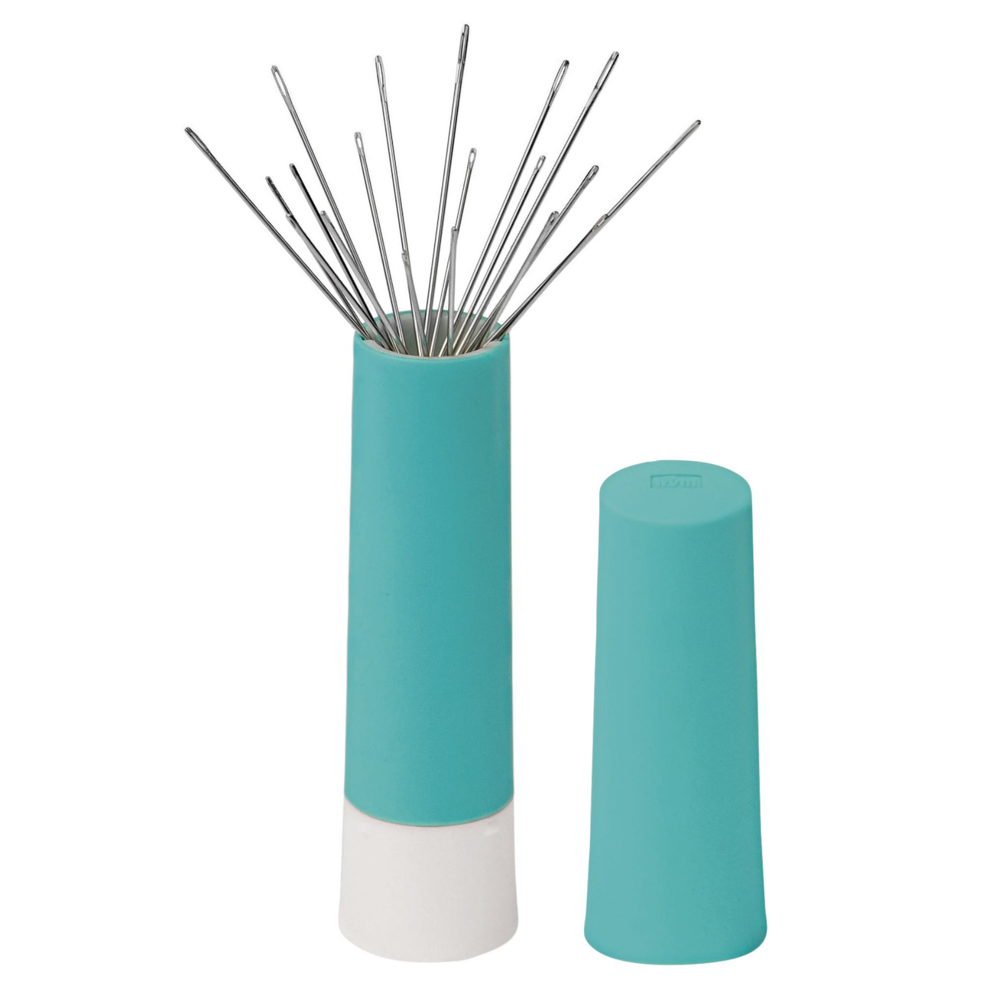 This patented and ergonomically-designed needle twister from the Prym Love collection is an assortment consisting of 19 hand sewing and darning needles. The needles are held by a magnet inside the needle twister. By turning the lower end of the twister, the needles can be comfortable screwed and unscrewed. When unscrewing the needles, they clearly fan out and can be easily identified and conveniently removed. In this manner, the needle twister serves as a mobile storage deposit for all steel needles.