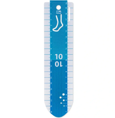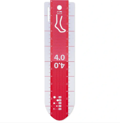 The practical hand gauge "Sock knitting" not only makes knitting or crocheting socks easier, it also offers fantastic versatility in additional uses: measuring the tension sample, integral knitting needle gauge, slots for attaching stitch markers, additional clip for holding memos or use as a bookmark. You can check progress in your knitting really easily at any time. The ruler in light, flexible plastic allows precise measurement when knitting socks – both in centimetres and in inches. The knitting needle gauge covers the 2.0 mm to 4.0 mm sizes usually used for knitting socks, as well as US sizes 0 to 6. It is a handy 20 cm in length and therefore this useful aid can be easily stowed away with the set of needles.
