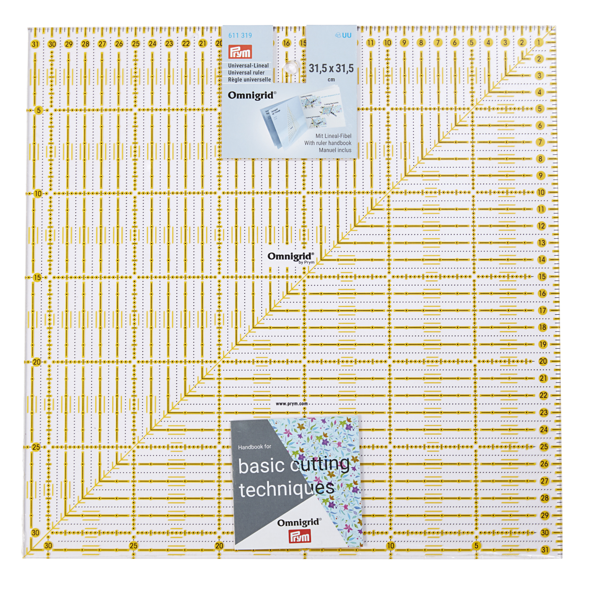 Whether on the cutting table or the sewing machine: the Omnigrid universal rulers from Prym are indispensable companions for patchwork, dressmaking and tailoring or for graphic work. The yellow and black grid markings in a metric or inch scale make it possible to mark accurately on both dark and light fabrics. The scratch-resistant laser print on the underside of the ruler prevents visual distortion. Thick, resistant, durable material guarantees safe guiding of rotary cutters and art knives on the cutting mat. Some versions of the Omnigrid rulers also have 30, 45 and 60 degree angle markings for cutting out triangles, diamonds and strips on the bias. To keep things tidy, it can be hung up by its eyelet