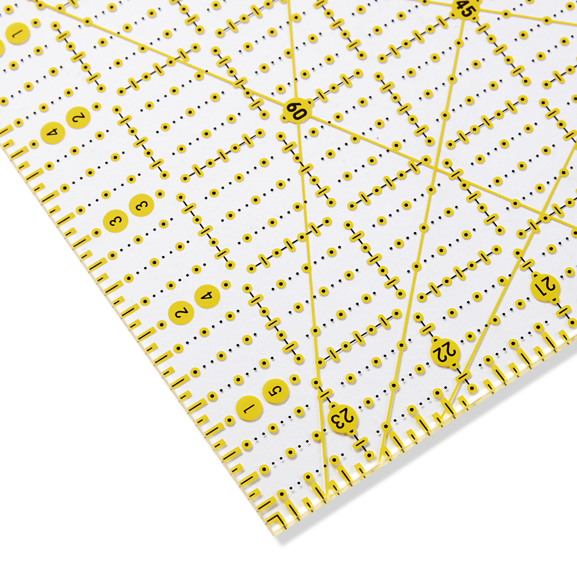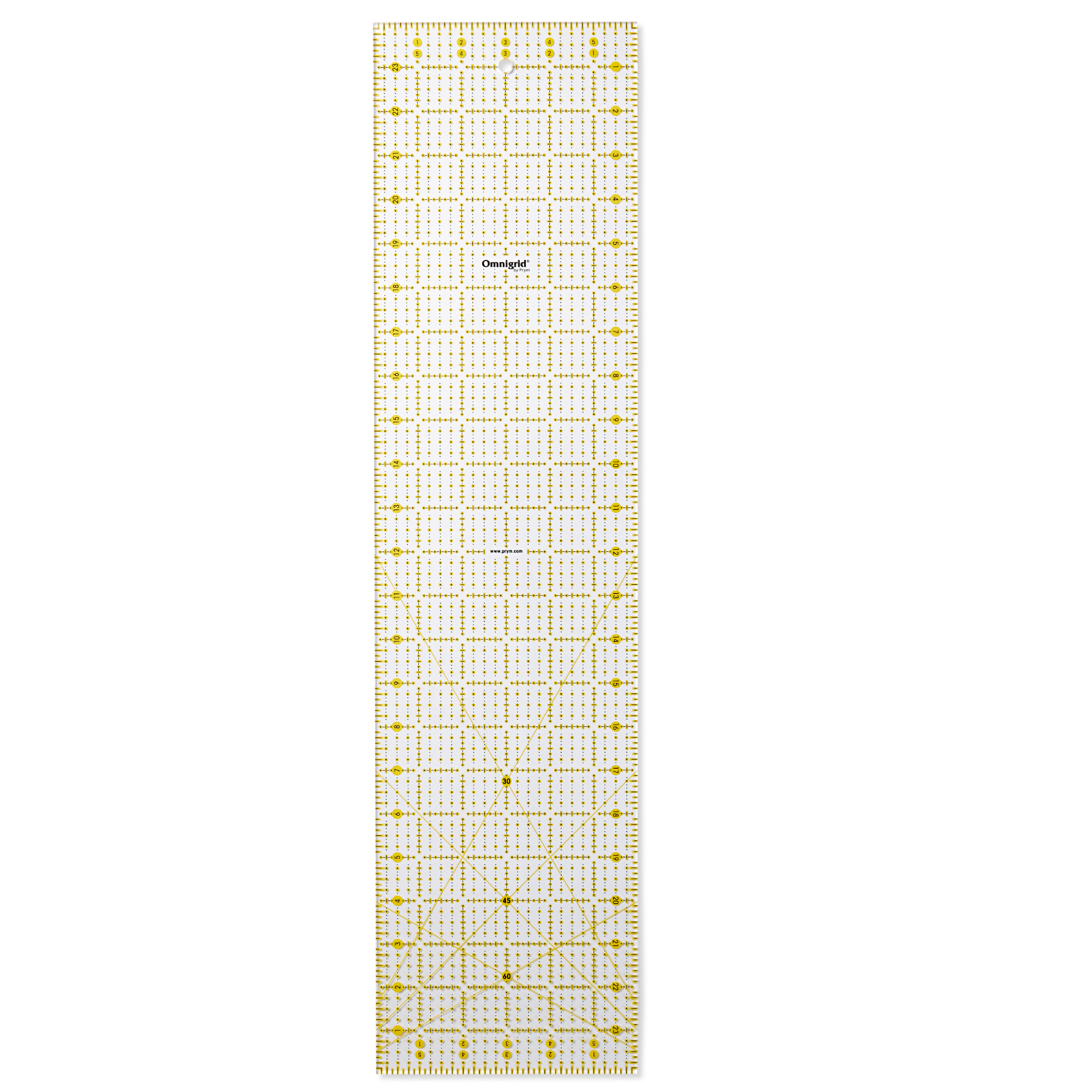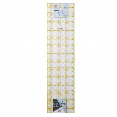 Whether on the cutting table or the sewing machine: the Omnigrid universal rulers from Prym are indispensable companions for patchwork, dressmaking and tailoring or for graphic work. The yellow and black grid markings in a metric or inch scale make it possible to mark accurately on both dark and light fabrics. The scratch-resistant laser print on the underside of the ruler prevents visual distortion. Thick, resistant, durable material guarantees safe guiding of rotary cutters and art knives on the cutting mat. Some versions of the Omnigrid rulers also have 30, 45 and 60 degree angle markings for cutting out triangles, diamonds and strips on the bias. To keep things tidy, it can be hung up by its eyelet.