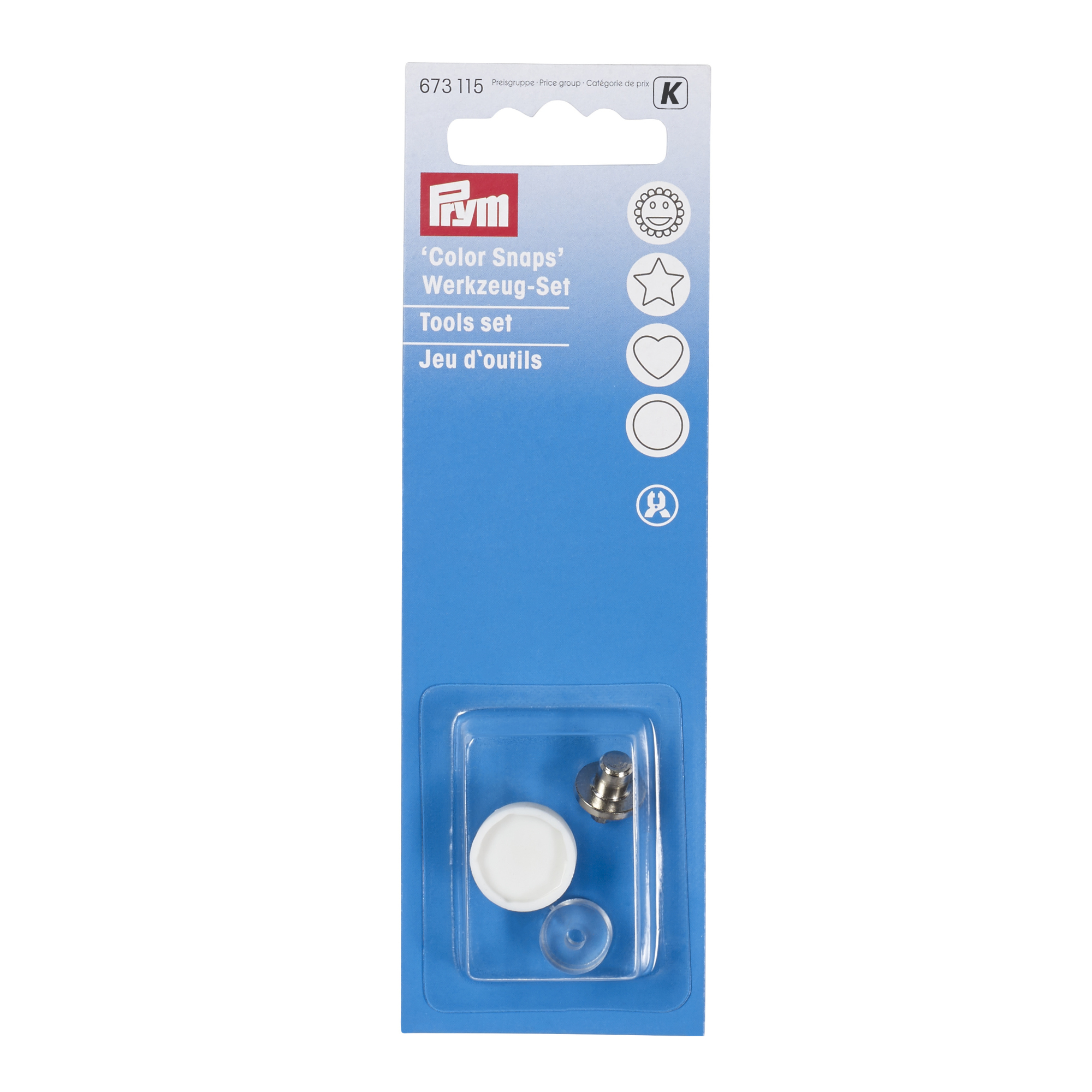 With this special Vario pliers tools set the Prym ‘Color Snaps’ can be easily installed The practical attachment is for all Snaps with a diameter of 12.4 mm. Simply insert the tools in the Vario pliers and get started with stars, hearts or roand designs of ‘Color Snaps’! In each package there are three tool parts made of hard rubber, plastic and metal - simply place the hard rubber buffer on the metal piece.